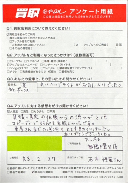 東京都板橋区 匿名希望様 車名:三菱 タウンボックス
