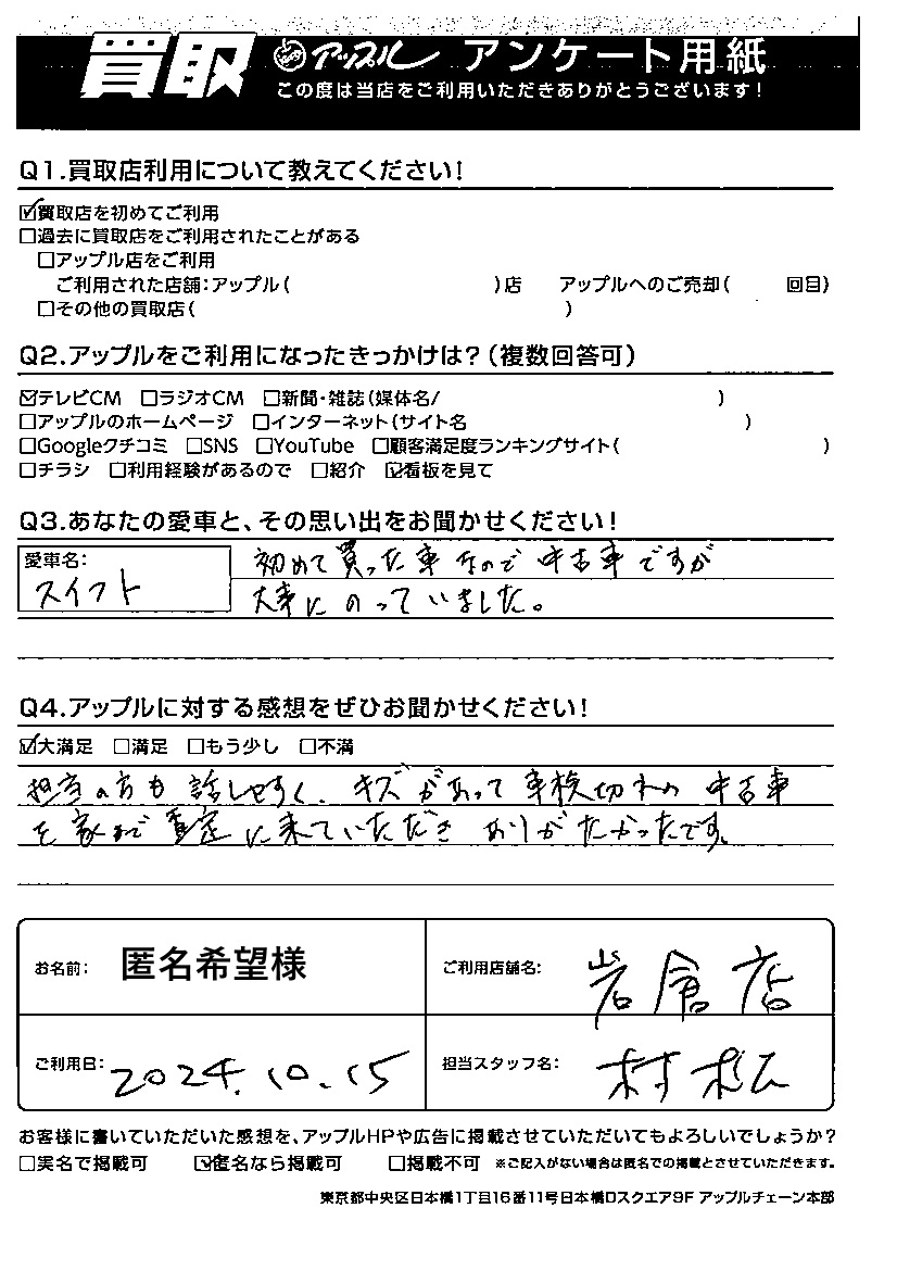 匿名希望様 車名:スズキ スイフト
