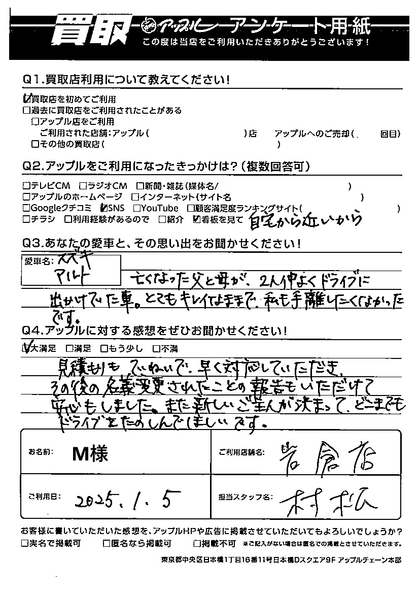 M様 車名:スズキ アルト (2015年12月以降のワークス含む)