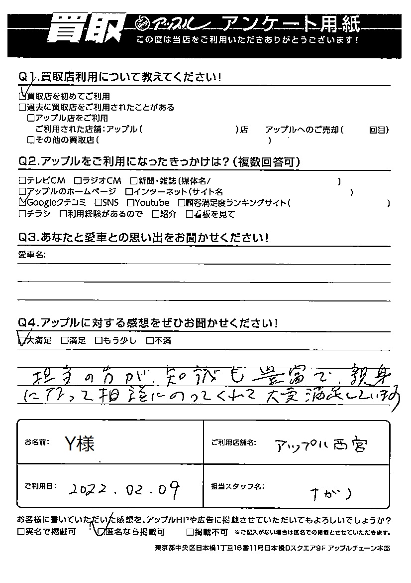 お車のご相談・ 査定だけでもOK! カンタン 入力 30秒 アップルがブランド買取始めました! お電話でも受付中! 受付時間9:30~19:00 0798-23-9033 お車のご相談・ 査定だけでもOK! カンタン 入力 30秒 アップルがブランド買取始めました! お電話でも受付中! 受付時間9:30~19:00 0798-23-9033 アップルがブランド買取始めました! お電話でも受付中! 受付時間9:30~19:00 0798-23-9033 店舗情報 在庫車 スタッフ紹介 ブログ お客様の声 キャンペーン 無料査定 click お客様の声 ご記入日: 2022/02/09 Y様 Q:アップルに対する感想をぜひお聞かせください!大満足担当の方が知識も豊富で親身になって相談にのってくれて大変満足しています。担当 アップル西宮コーナン今津店 長野 前へ 次へ お客様の声一覧を見る