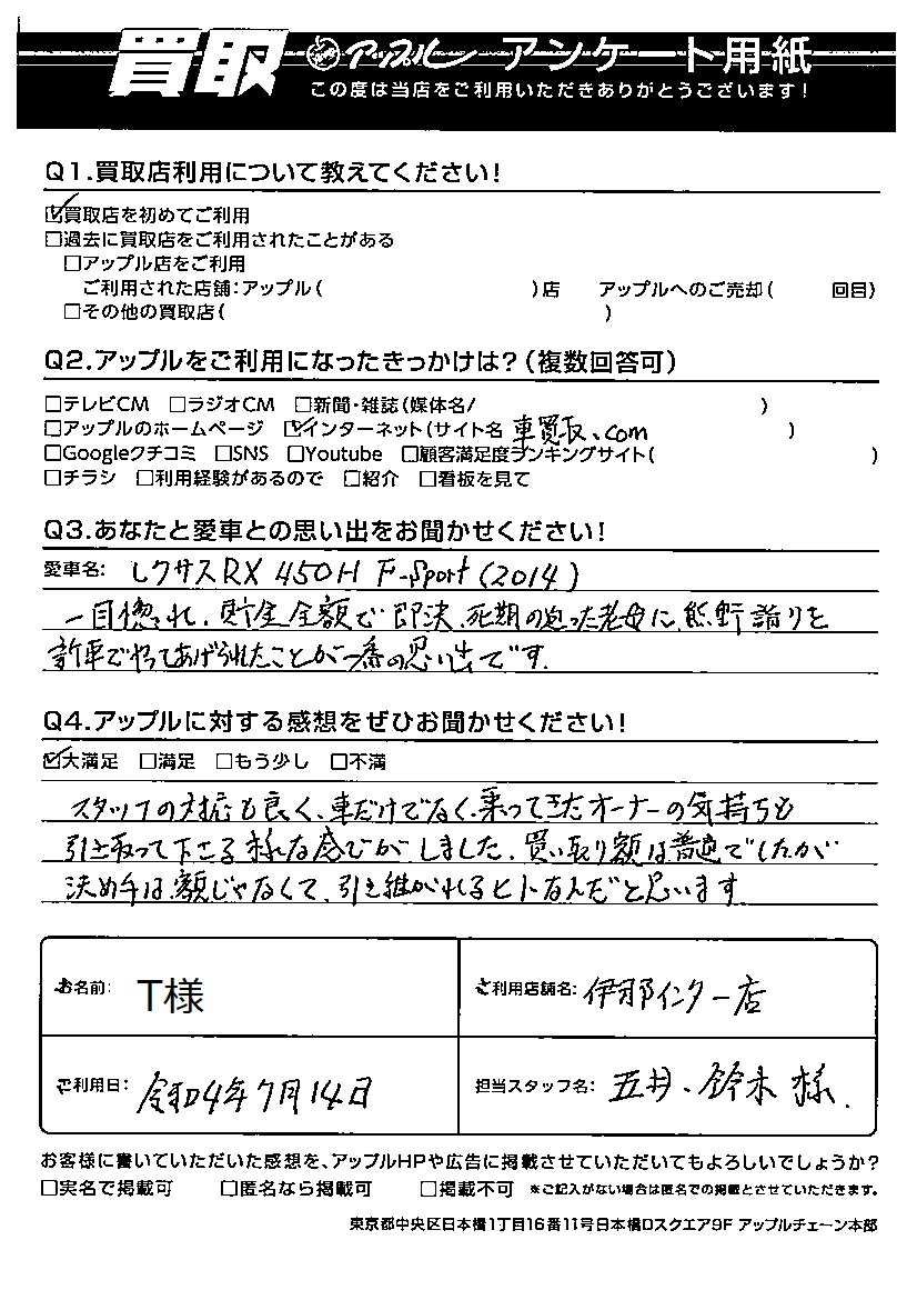 T様 車名:レクサス RXハイブリッド(国内仕様 H27年9月迄)