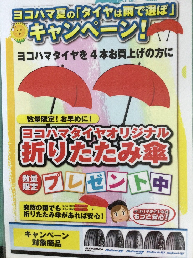 雨に強いタイヤ4本お買い上げ頂いたお客様に折りたたみ傘をプレゼントしております。