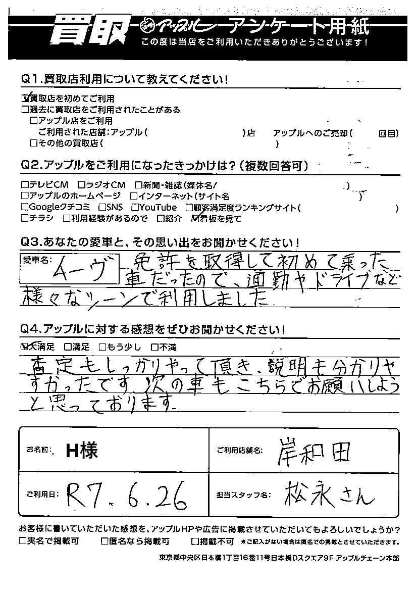 査定もしっかりやって頂き、説明も分かりやすかったです。次の車もこちらでお願いしようと思っております。