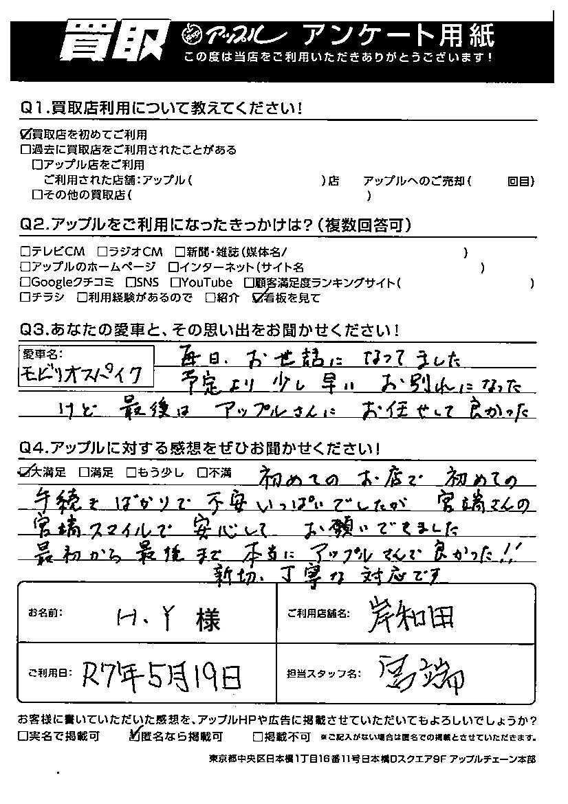 初めてのお店で初めての手続きばかりで不安いっぱいでしたが、宮端さんの宮端スマイルで安心してお願いできました。最初から最後まで本当にアップルさんで良かった!!親切、丁寧な対応です。