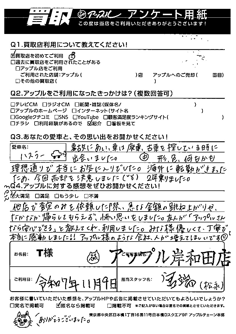 他店で査定のみを依頼した際、急な金額の跳ね上がりや、なかなか帰らしてもらえず、怖い思いをしました。友人が「アップルさんなら安心できる」と教えてくれ、利用しました。みな様 優しくて、丁寧で本当に感動しました!!アップル様のような会社、人が増えてほしいです(^^)