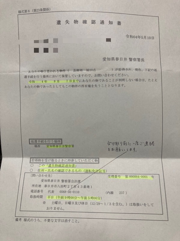 2012年6月に名古屋で盗まれた財布が見つかったと