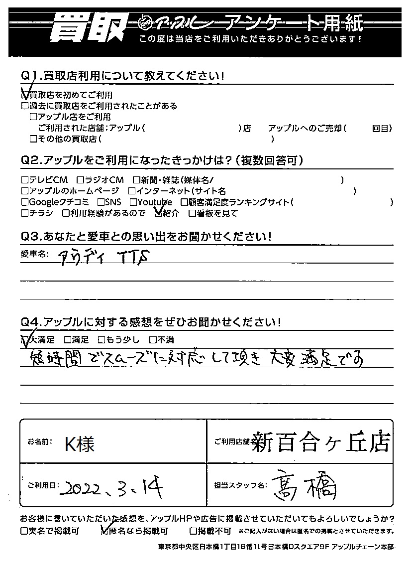 お車のご相談・ 査定だけでもOK! カンタン 入力 30秒 アップルがブランド買取始めました! お電話でも受付中! 受付時間9:00~18:00 044-981-0901 お車のご相談・ 査定だけでもOK! カンタン 入力 30秒 アップルがブランド買取始めました! お電話でも受付中! 受付時間9:00~18:00 044-981-0901 アップルがブランド買取始めました! お電話でも受付中! 受付時間9:00~18:00 044-981-0901 店舗情報 在庫車 スタッフ紹介 ブログ お客様の声 キャンペーン 無料査定 click お客様の声 ご記入日: 2022/03/14 神奈川県横浜市 K様 車名:アウディ TTSクーペ 短時間でスムーズに対応して頂き大変満足です。 前へ 次へ お客様の声一覧を見る