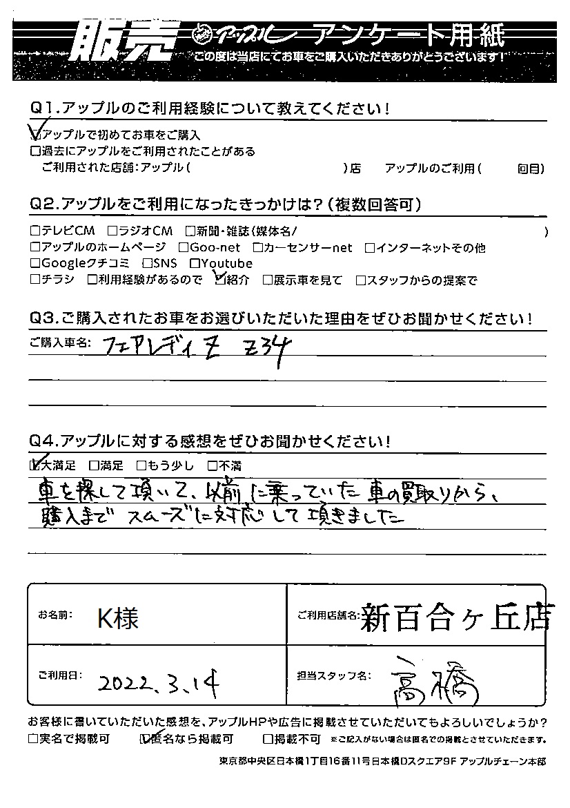 お車のご相談・ 査定だけでもOK! カンタン 入力 30秒 アップルがブランド買取始めました! お電話でも受付中! 受付時間9:00~18:00 044-981-0901 お車のご相談・ 査定だけでもOK! カンタン 入力 30秒 アップルがブランド買取始めました! お電話でも受付中! 受付時間9:00~18:00 044-981-0901 アップルがブランド買取始めました! お電話でも受付中! 受付時間9:00~18:00 044-981-0901 店舗情報 在庫車 スタッフ紹介 ブログ お客様の声 キャンペーン 無料査定 click お客様の声 ご記入日: 2022/03/14 神奈川県横浜市 K様 車名:日産 フェアレディZ 車を探して頂いて、以前に乗っていた車の買い取りから、購入までスムーズに対応して頂きました。 前へ 次へ お客様の声一覧を見る
