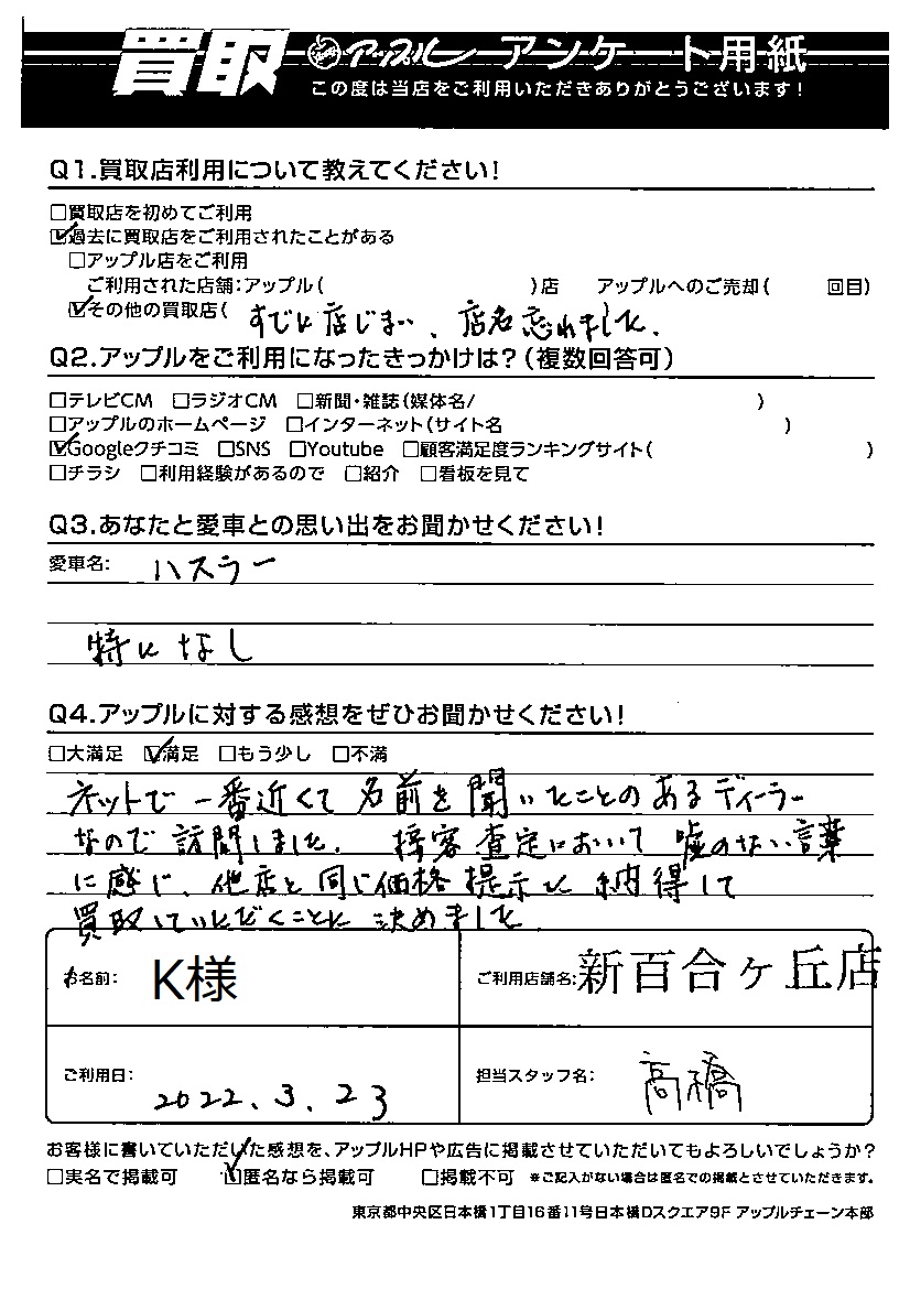お車のご相談・ 査定だけでもOK! カンタン 入力 30秒 アップルがブランド買取始めました! お電話でも受付中! 受付時間9:00~18:00 044-981-0901 お車のご相談・ 査定だけでもOK! カンタン 入力 30秒 アップルがブランド買取始めました! お電話でも受付中! 受付時間9:00~18:00 044-981-0901 アップルがブランド買取始めました! お電話でも受付中! 受付時間9:00~18:00 044-981-0901 店舗情報 在庫車 スタッフ紹介 ブログ お客様の声 キャンペーン 無料査定 click お客様の声 ご記入日: 2022/03/23 川崎市麻生区 K様 車名:スズキ ハスラー ネットで一番近くて名前を聞いたことのあるディーラーなので訪問しました。接客査定において嘘のない言葉に感じ、他店と同じ価格提示に納得して買取していただくことに決めました。 前へ 次へ お客様の声一覧を見る