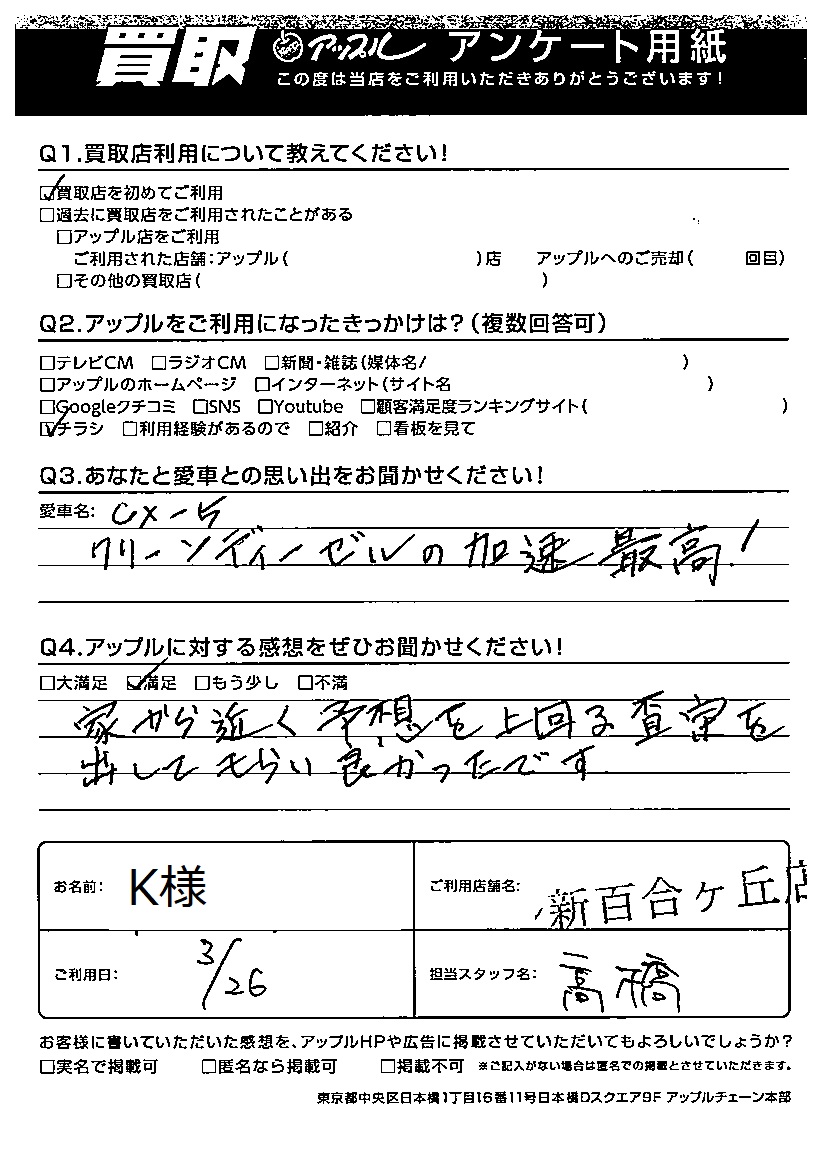お車のご相談・ 査定だけでもOK! カンタン 入力 30秒 アップルがブランド買取始めました! お電話でも受付中! 受付時間9:00~18:00 044-981-0901 お車のご相談・ 査定だけでもOK! カンタン 入力 30秒 アップルがブランド買取始めました! お電話でも受付中! 受付時間9:00~18:00 044-981-0901 アップルがブランド買取始めました! お電話でも受付中! 受付時間9:00~18:00 044-981-0901 店舗情報 在庫車 スタッフ紹介 ブログ お客様の声 キャンペーン 無料査定 click お客様の声 ご記入日: 2022/03/26 麻生区 K様 車名:マツダ CX-5 家から近く予想を上回る査定を出してもらい良かったです。 前へ 次へ お客様の声一覧を見る