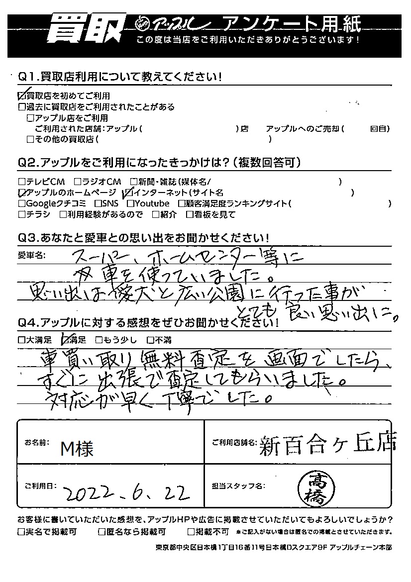 お車のご相談・ 査定だけでもOK! カンタン 入力 30秒 アップルがブランド買取始めました! お電話でも受付中! 受付時間9:00~18:00 044-981-0901 お車のご相談・ 査定だけでもOK! カンタン 入力 30秒 アップルがブランド買取始めました! お電話でも受付中! 受付時間9:00~18:00 044-981-0901 アップルがブランド買取始めました! お電話でも受付中! 受付時間9:00~18:00 044-981-0901 店舗情報 在庫車 スタッフ紹介 ブログ お客様の声 キャンペーン 無料査定 click お客様の声 ご記入日: 2022/06/22 M様 車名:日産 モコ 車買い取り無料査定を画面でしたら、すぐに出張で査定してもらいました。対応が早く丁寧でした。 前へ 次へ お客様の声一覧を見る