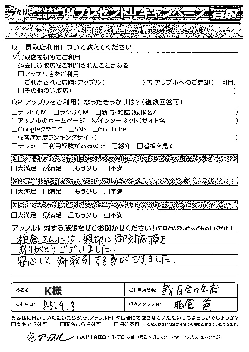 お車のご相談・ 査定だけでもOK! カンタン 入力 30秒 アップルがブランド買取始めました! お電話でも受付中! 受付時間9:00~18:00 044-981-0901 お車のご相談・ 査定だけでもOK! カンタン 入力 30秒 アップルがブランド買取始めました! お電話でも受付中! 受付時間9:00~18:00 044-981-0901 アップルがブランド買取始めました! お電話でも受付中! 受付時間9:00~18:00 044-981-0901 店舗情報 在庫車 スタッフ紹介 ブログ お客様の声 キャンペーン 無料査定 click お客様の声 ご記入日: 2023/09/03 K様 ご利用日:2023年9月3日担当:柏倉Q:アップルに対する感想をぜひお聞かせください!A:満足 柏倉さんには親切にご対応頂きありがとうございました。 安心して御取引きする事ができました。 前へ 次へ お客様の声一覧を見る
