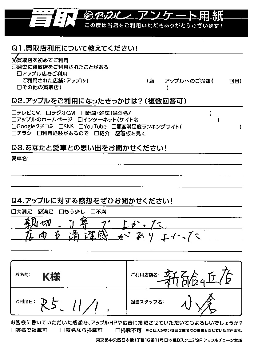 お車のご相談・ 査定だけでもOK! カンタン 入力 30秒 アップルがブランド買取始めました! お電話でも受付中! 受付時間9:00~18:00 044-981-0901 お車のご相談・ 査定だけでもOK! カンタン 入力 30秒 アップルがブランド買取始めました! お電話でも受付中! 受付時間9:00~18:00 044-981-0901 アップルがブランド買取始めました! お電話でも受付中! 受付時間9:00~18:00 044-981-0901 店舗情報 在庫車 スタッフ紹介 ブログ お客様の声 キャンペーン 無料査定 click お客様の声 ご記入日: 2023/11/01 K様 ご利用日:2023年11月1日担当:小倉Q:アップルに対する感想をぜひお聞かせください!!A:満足 親切・丁寧でよかった。 店内も清潔感がありよかった。 前へ 次へ お客様の声一覧を見る