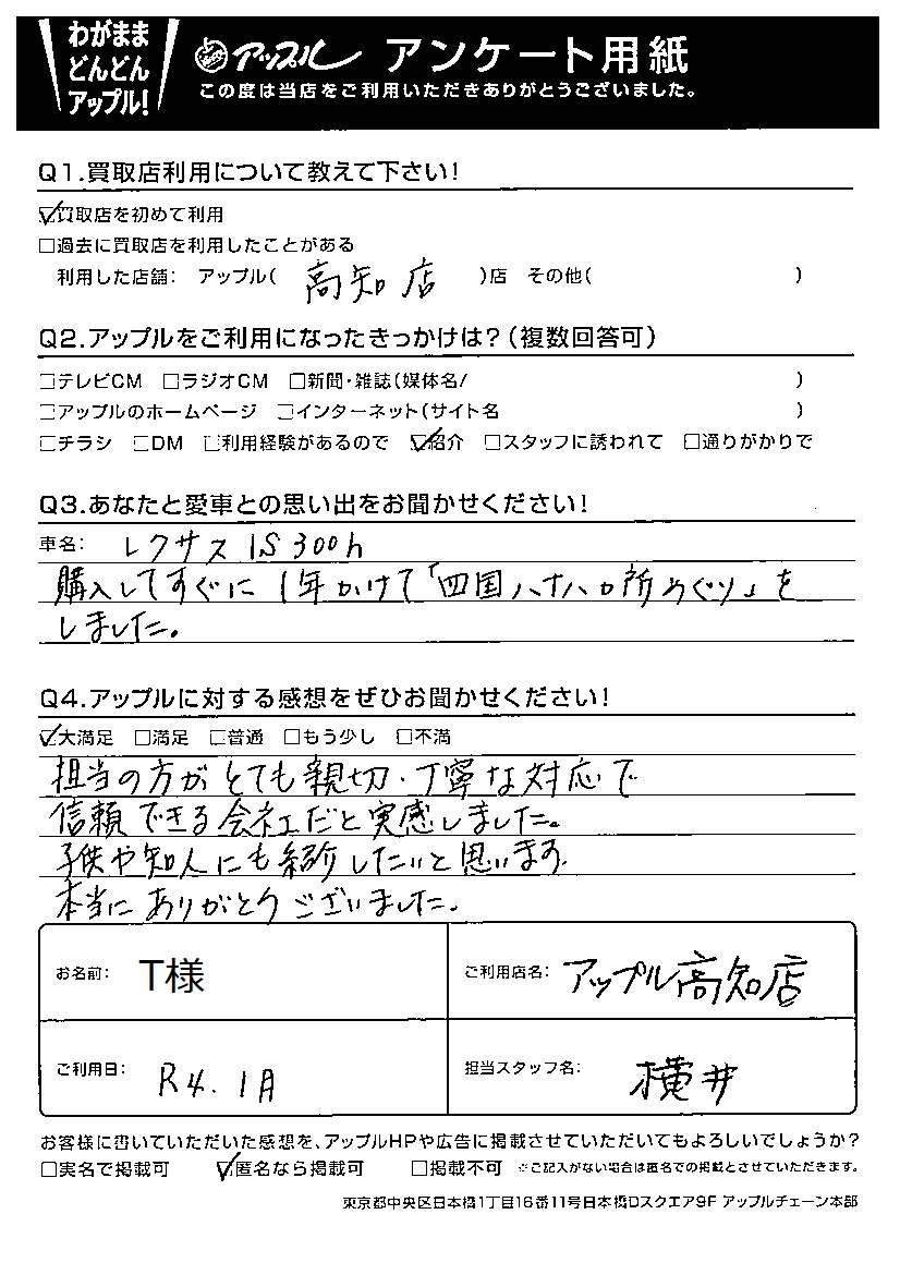 T様 車名:レクサス IS (国内仕様 右H)