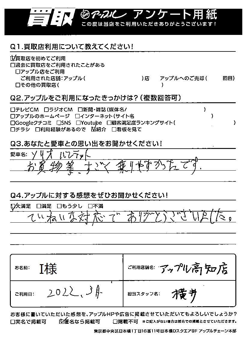 お車のご相談・ 査定だけでもOK! カンタン 入力 30秒 アップルがブランド買取始めました! お電話でも受付中! 受付時間10:00~19:00 ※日曜日は10:00~18:00とさせていただいております。 0120-939352 お車のご相談・ 査定だけでもOK! カンタン 入力 30秒 アップルがブランド買取始めました! お電話でも受付中! 受付時間10:00~19:00 ※日曜日は10:00~18:00とさせていただいております。 0120-939352 アップルがブランド買取始めました! お電話でも受付中! 受付時間10:00~19:00 ※日曜日は10:00~18:00とさせていただいております。 0120-939352 店舗情報 在庫車 スタッフ紹介 ブログ お客様の声 キャンペーン 無料査定 click お客様の声 ご記入日: 2022/03/01 I様 車名:スズキ ソリオ Q あなたと愛車との思い出をお聞かせください!お買物等、すごく乗りやすかったです。Q アップルに対する感想をぜひお聞かせください!感想:大満足ていねいな対応でありがとうございました。 前へ 次へ お客様の声一覧を見る
