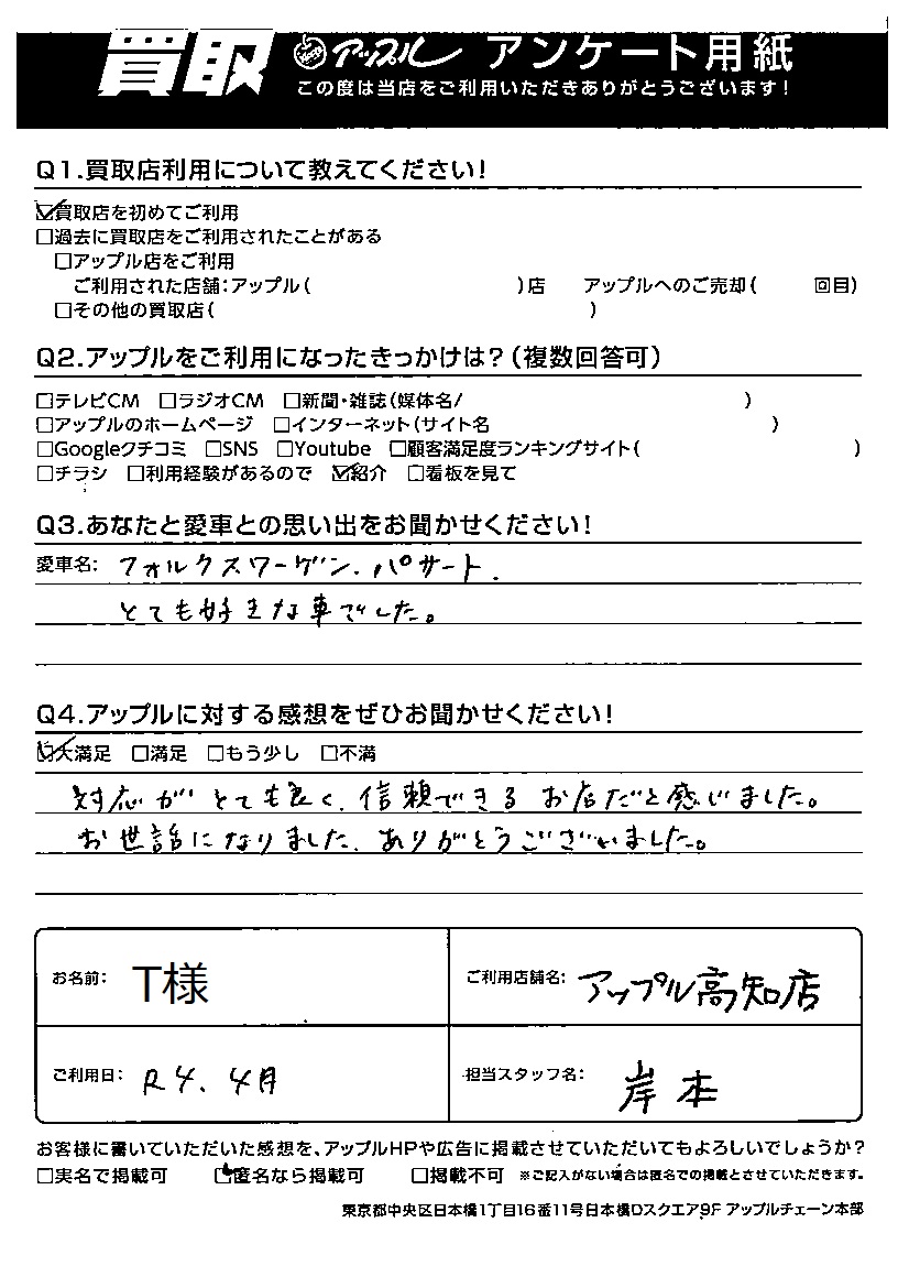 T様 車名:フォルクスワーゲン パサート