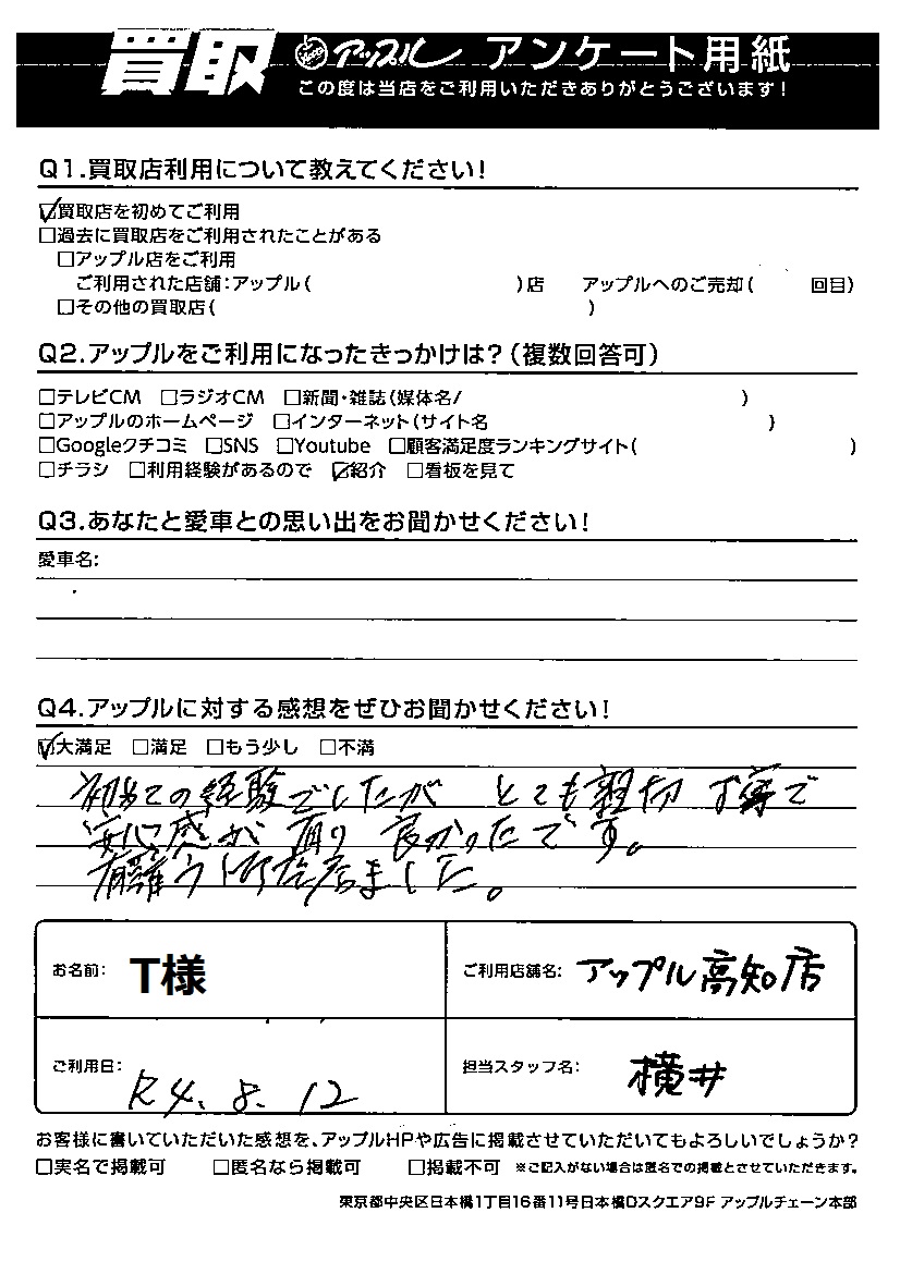 お車のご相談・ 査定だけでもOK! カンタン 入力 30秒 アップルがブランド買取始めました! お電話でも受付中! 受付時間10:00~19:00 ※日曜日は10:00~18:00とさせていただいております。 0120-939352 お車のご相談・ 査定だけでもOK! カンタン 入力 30秒 アップルがブランド買取始めました! お電話でも受付中! 受付時間10:00~19:00 ※日曜日は10:00~18:00とさせていただいております。 0120-939352 アップルがブランド買取始めました! お電話でも受付中! 受付時間10:00~19:00 ※日曜日は10:00~18:00とさせていただいております。 0120-939352 店舗情報 在庫車 スタッフ紹介 ブログ お客様の声 キャンペーン 無料査定 click お客様の声 ご記入日: 2022/08/12 T様 Q アップルに対する感想をぜひお聞かせください!感想:大満足初めての経験でしたが、とても親切丁寧で安心感が有り良かったです。有難うございました。 前へ 次へ お客様の声一覧を見る