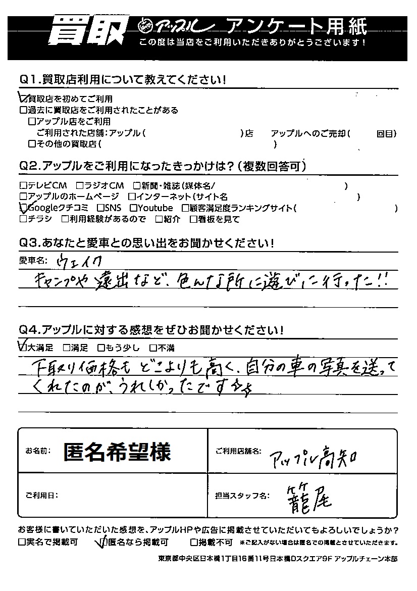 下取り価格よりも どこよりも高く、自分の車の写真を送ってくれたのが、うれしかったです★★