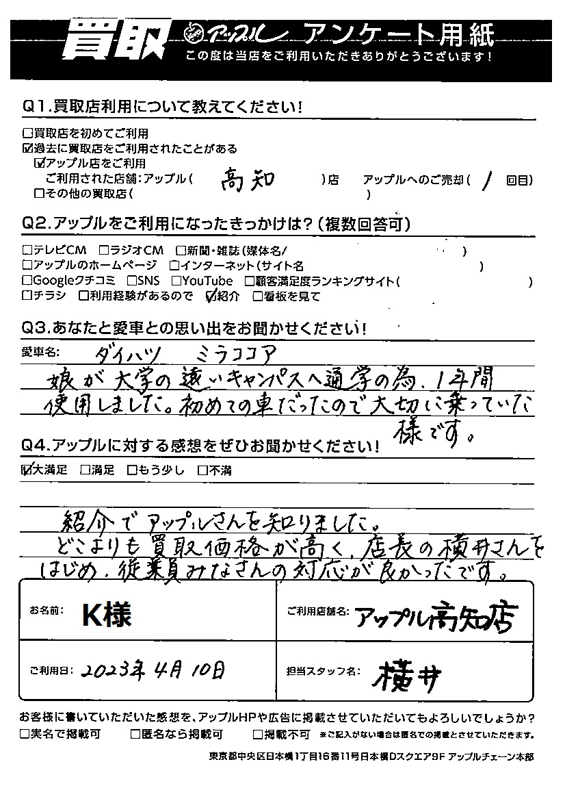 どこよりも買取価格が高く、店長の横井さんをはじめ、従業員みなさんの対応が良かったです。
