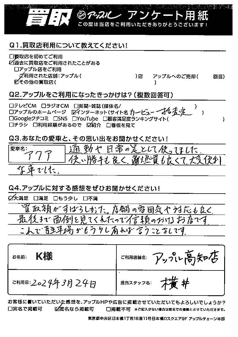 K様 車名:トヨタ アクア