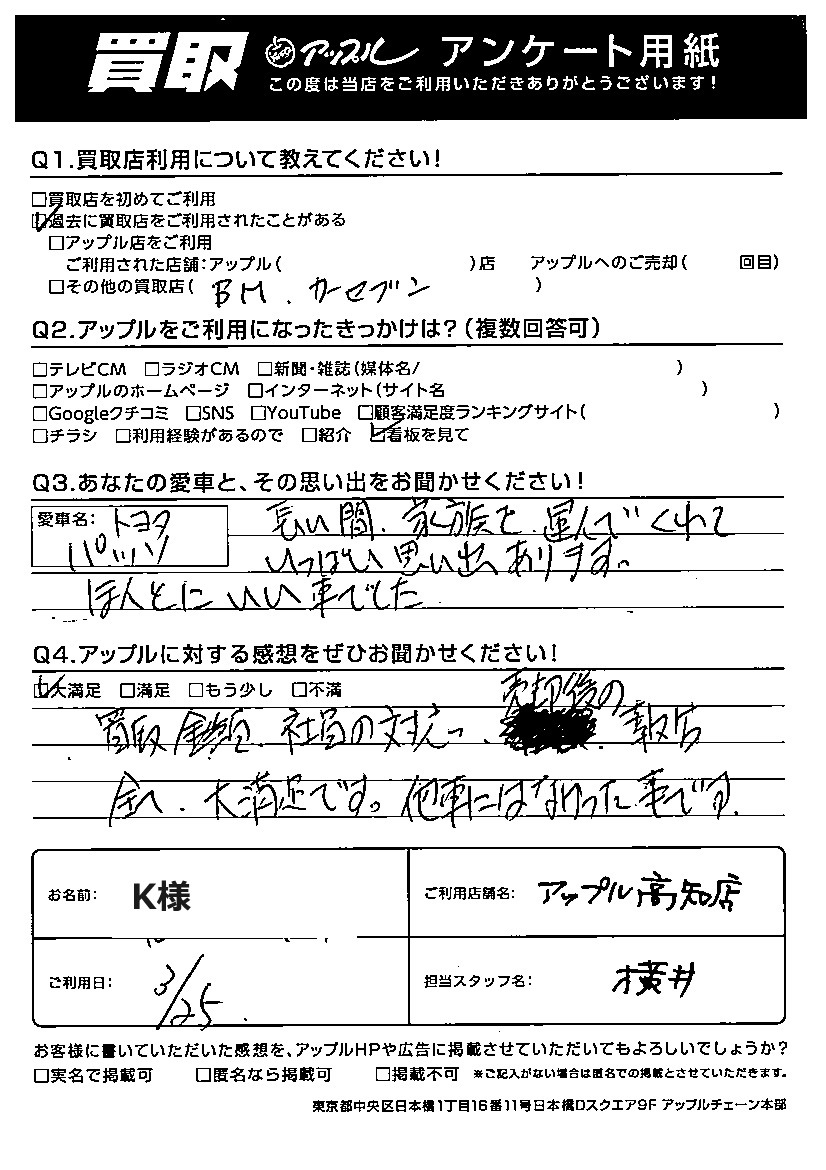 K様 車名:トヨタ パッソ