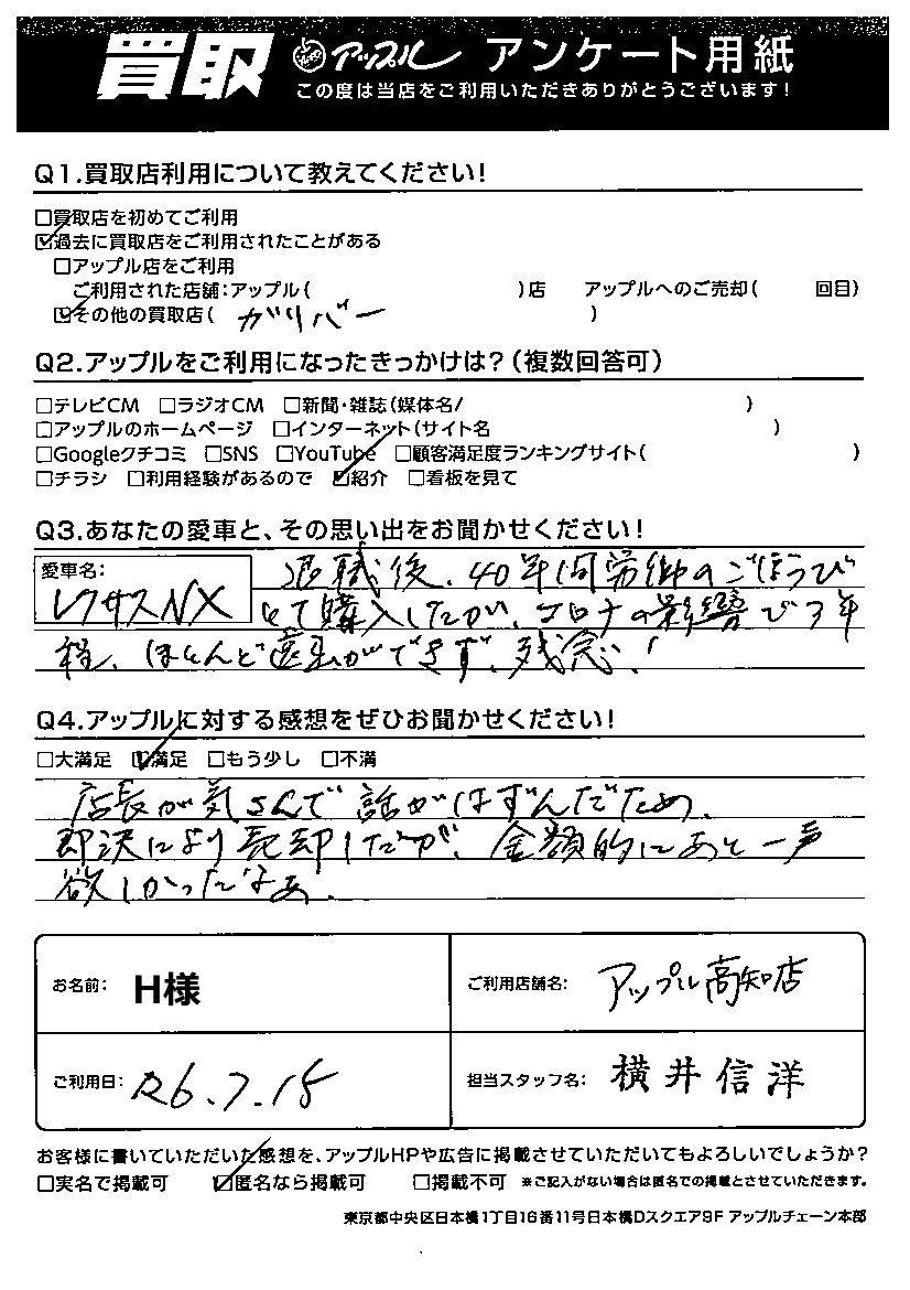 店長が気さくで話がはずんだため即決により売却したが、金額的にあと一声欲しかったなぁ。