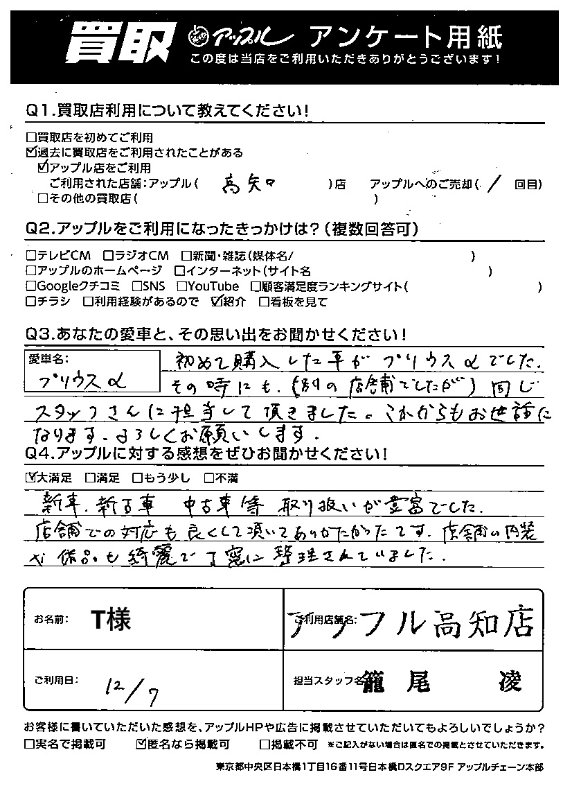 初めて購入した車がプリウスαでした。その時にも(別の店舗でしたが)同じスタッフさんに担当して頂きました。これからもお世話になります。よろしくお願いします。