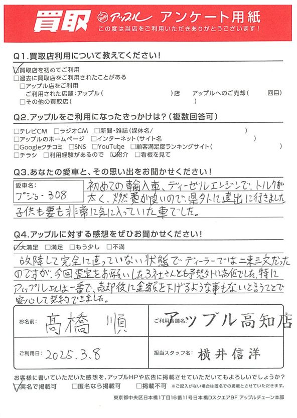 故障して完全に直っていない状態でディーラーでは二束三文だったのですが、今回査定をお願いした3社さんとも予想外に高値でした。特にアップルさんは一番で、売却後に金額を下げるような事もないと言うことで安心して契約できました。
