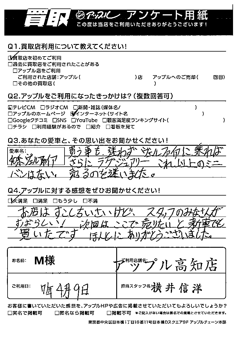 M様 車名:トヨタ ヴェルファイア(H27年1月~のHYBRID含む)