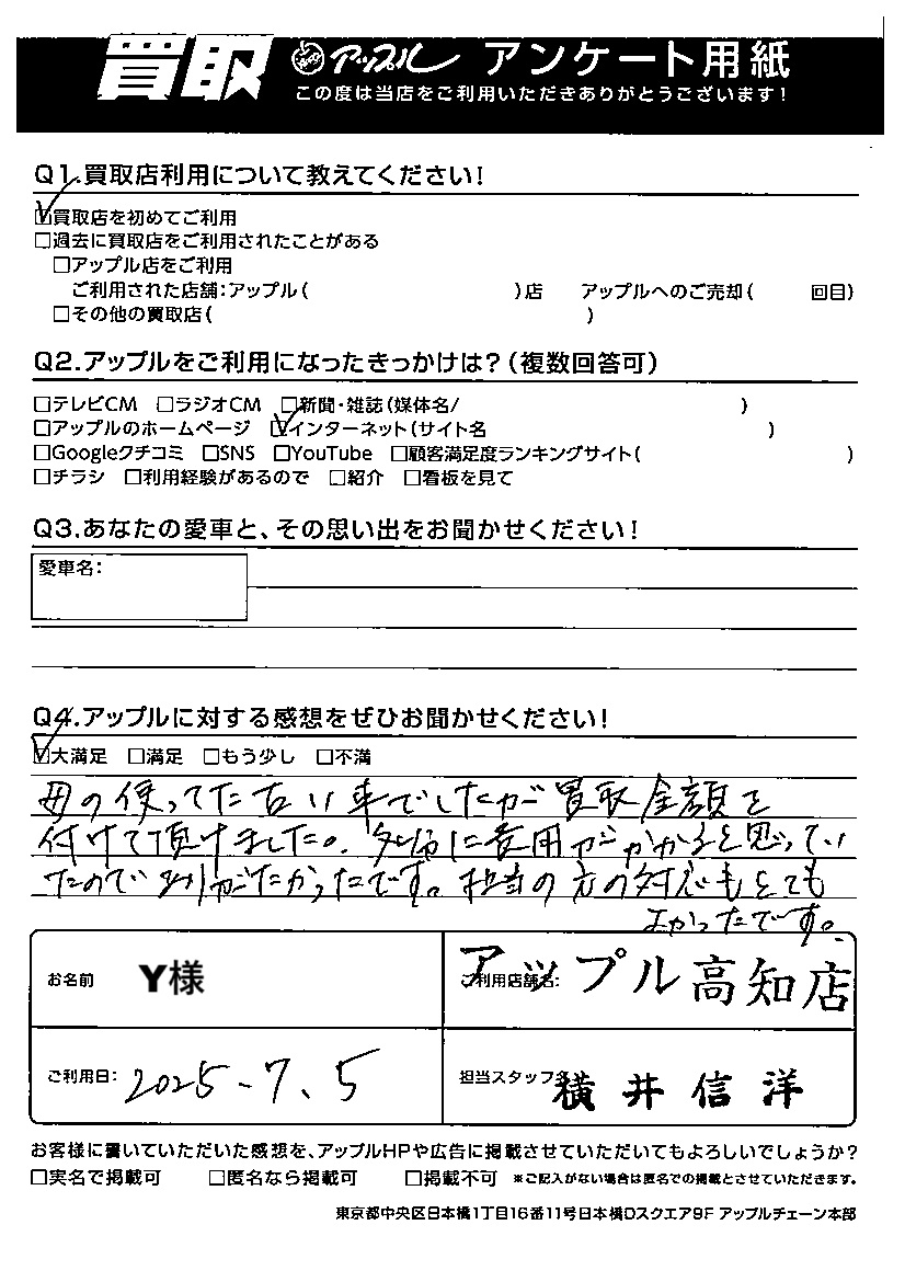 母の使ってた古い車でしたが、買取金額を付けて頂けました。処分に費用がかかると思っていたので、ありがたかったです。担当の方の対応もとてもよかったです。