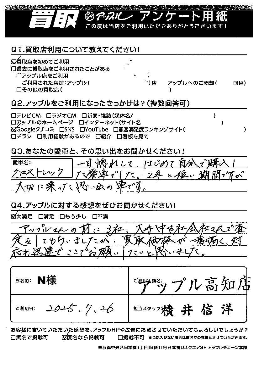 アップルさんの前に3社、大手中古車会社さんで査定をしてもらいましたが、買取価格が一番高く、対応も迅速でここでお願いしたいと思いました。
