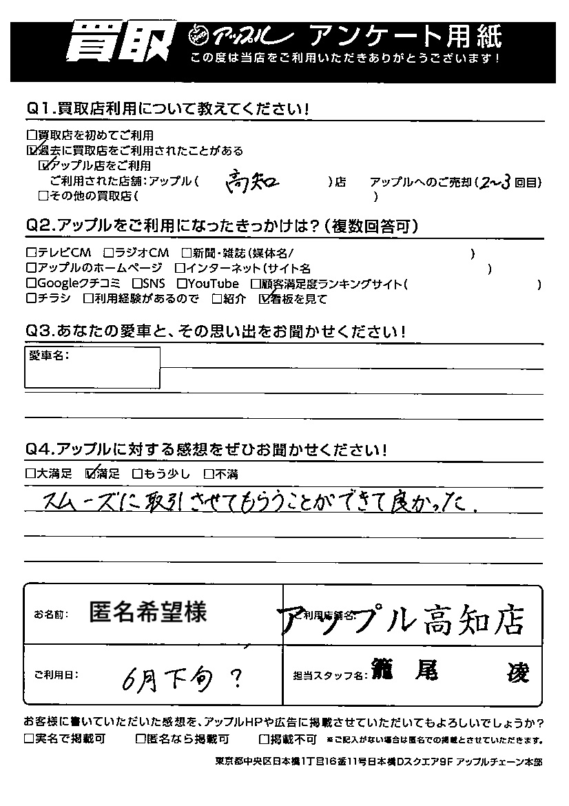 お車のご相談・ 査定だけでもOK! カンタン 入力 30秒 アップルがブランド買取始めました! お電話でも受付中! 受付時間10:00~19:00 ※日曜日は10:00~18:00とさせていただいております。 0120-939352 お車のご相談・ 査定だけでもOK! カンタン 入力 30秒 アップルがブランド買取始めました! お電話でも受付中! 受付時間10:00~19:00 ※日曜日は10:00~18:00とさせていただいております。 0120-939352 アップルがブランド買取始めました! お電話でも受付中! 受付時間10:00~19:00 ※日曜日は10:00~18:00とさせていただいております。 0120-939352 店舗情報 在庫車 スタッフ紹介 ブログ お客様の声 キャンペーン 無料査定 click お客様の声 ご記入日: 2025/06/30 匿名希望様 【アップルに対する感想をぜひお聞かせ下さい!】満足!スムーズに取引させてもらうことができて良かった。担当:籠尾 前へ 次へ お客様の声一覧を見る