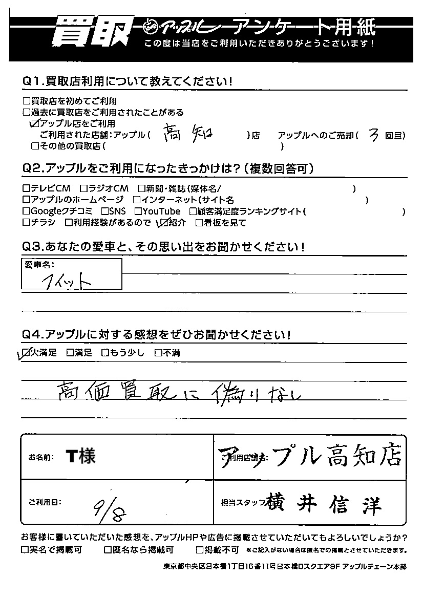 お車のご相談・ 査定だけでもOK! カンタン 入力 30秒 アップルがブランド買取始めました! お電話でも受付中! 受付時間10:00~19:00 ※日曜日は10:00~18:00とさせていただいております。 0120-939352 お車のご相談・ 査定だけでもOK! カンタン 入力 30秒 アップルがブランド買取始めました! お電話でも受付中! 受付時間10:00~19:00 ※日曜日は10:00~18:00とさせていただいております。 0120-939352 アップルがブランド買取始めました! お電話でも受付中! 受付時間10:00~19:00 ※日曜日は10:00~18:00とさせていただいております。 0120-939352 店舗情報 在庫車 スタッフ紹介 ブログ お客様の声 キャンペーン 無料査定 click お客様の声 ご記入日: 2025/09/08 T様 車名:ホンダ フィット(H25年9月以降のハイブリッド含む) 【あなたと愛車との思い出をお聞かせ下さい!】愛車名:フィット【アップルに対する感想をぜひお聞かせ下さい!】大満足!高価買取に偽りなし担当:横井 前へ 次へ お客様の声一覧を見る