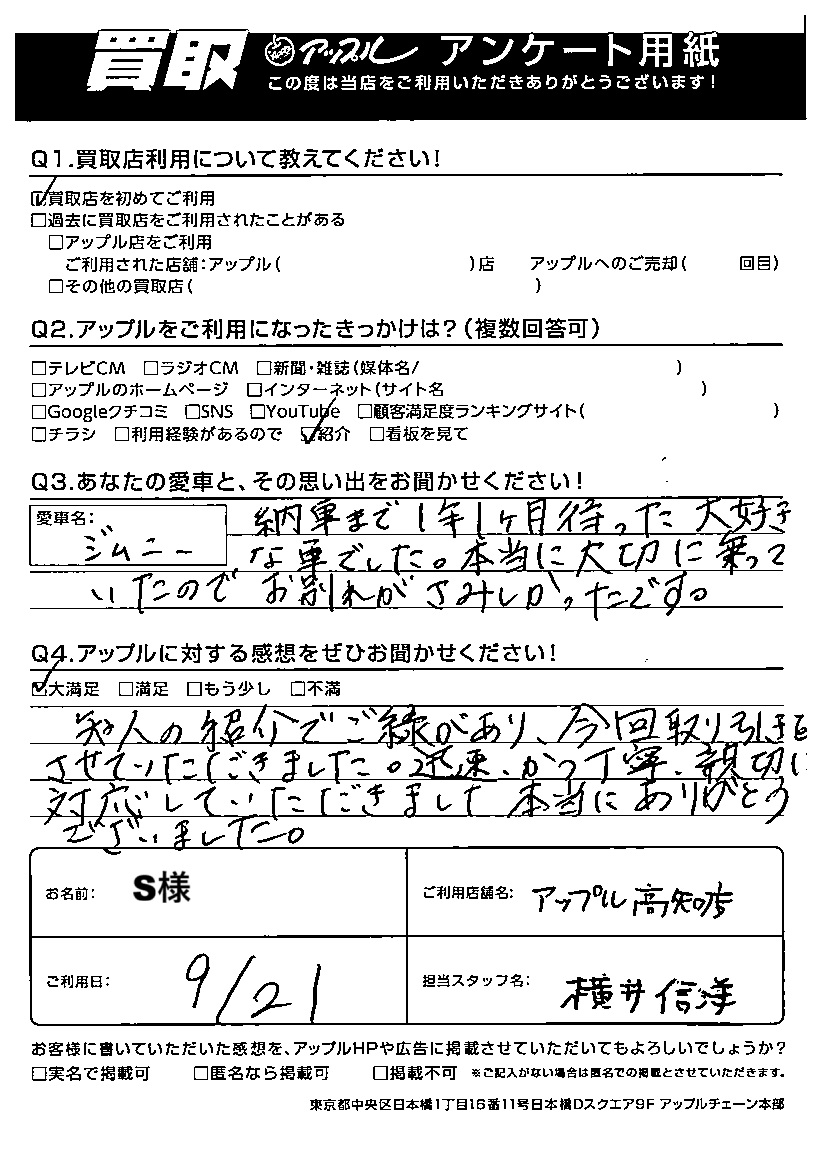 知人の紹介でご縁があり、今回取り引きをさせていただきました。迅速、かつ丁寧、親切に対応していただきました。本当にありがとうございました。