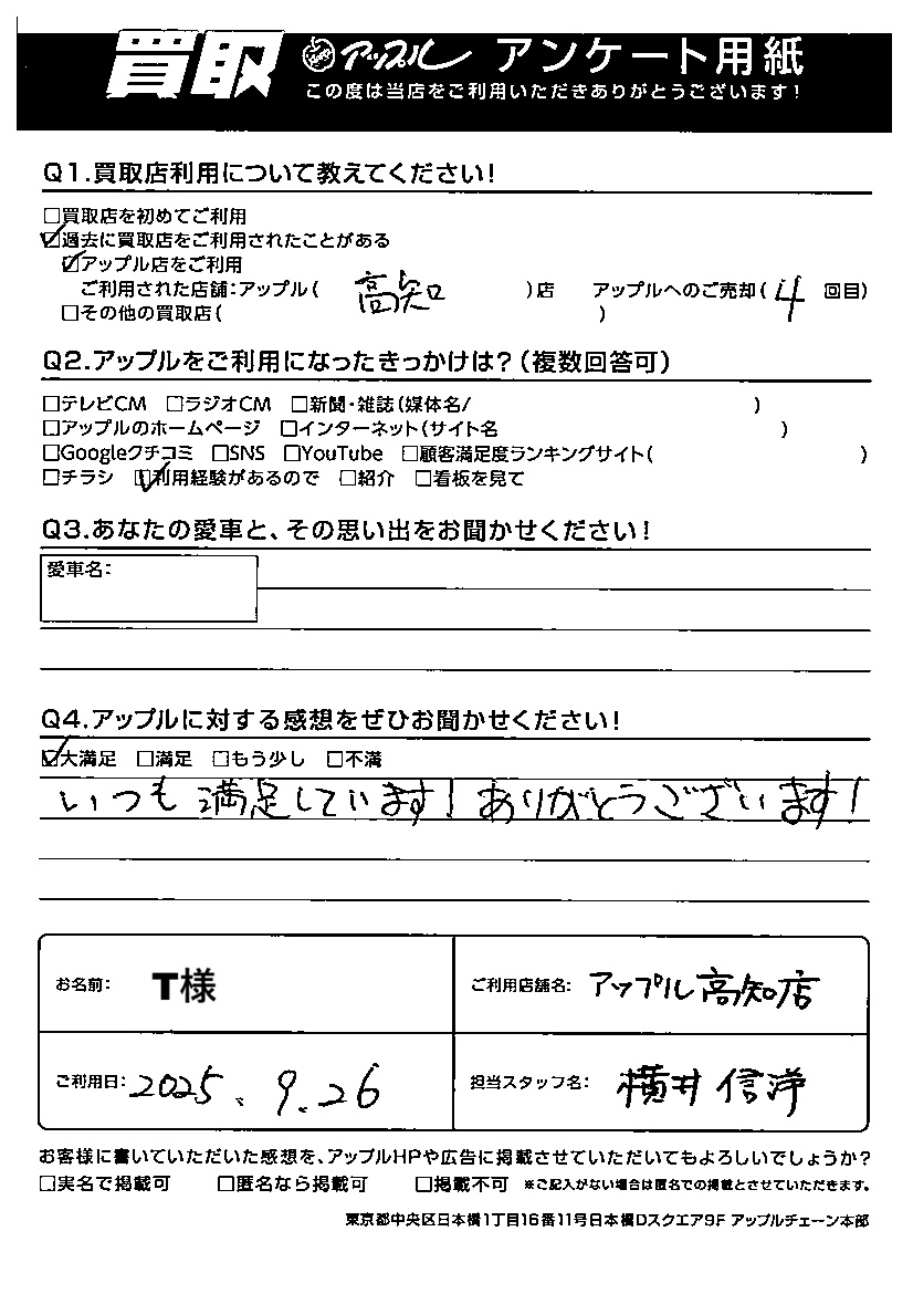 お車のご相談・ 査定だけでもOK! カンタン 入力 30秒 アップルがブランド買取始めました! お電話でも受付中! 受付時間10:00~19:00 ※日曜日は10:00~18:00とさせていただいております。 0120-939352 お車のご相談・ 査定だけでもOK! カンタン 入力 30秒 アップルがブランド買取始めました! お電話でも受付中! 受付時間10:00~19:00 ※日曜日は10:00~18:00とさせていただいております。 0120-939352 アップルがブランド買取始めました! お電話でも受付中! 受付時間10:00~19:00 ※日曜日は10:00~18:00とさせていただいております。 0120-939352 店舗情報 在庫車 スタッフ紹介 ブログ お客様の声 キャンペーン お得 無料査定 click お客様の声 ご記入日: 2025/09/26 T様 【アップルに対する感想をぜひお聞かせ下さい!】大満足!いつも満足しています!ありがとうございます!担当:横井 前へ 次へ お客様の声一覧を見る
