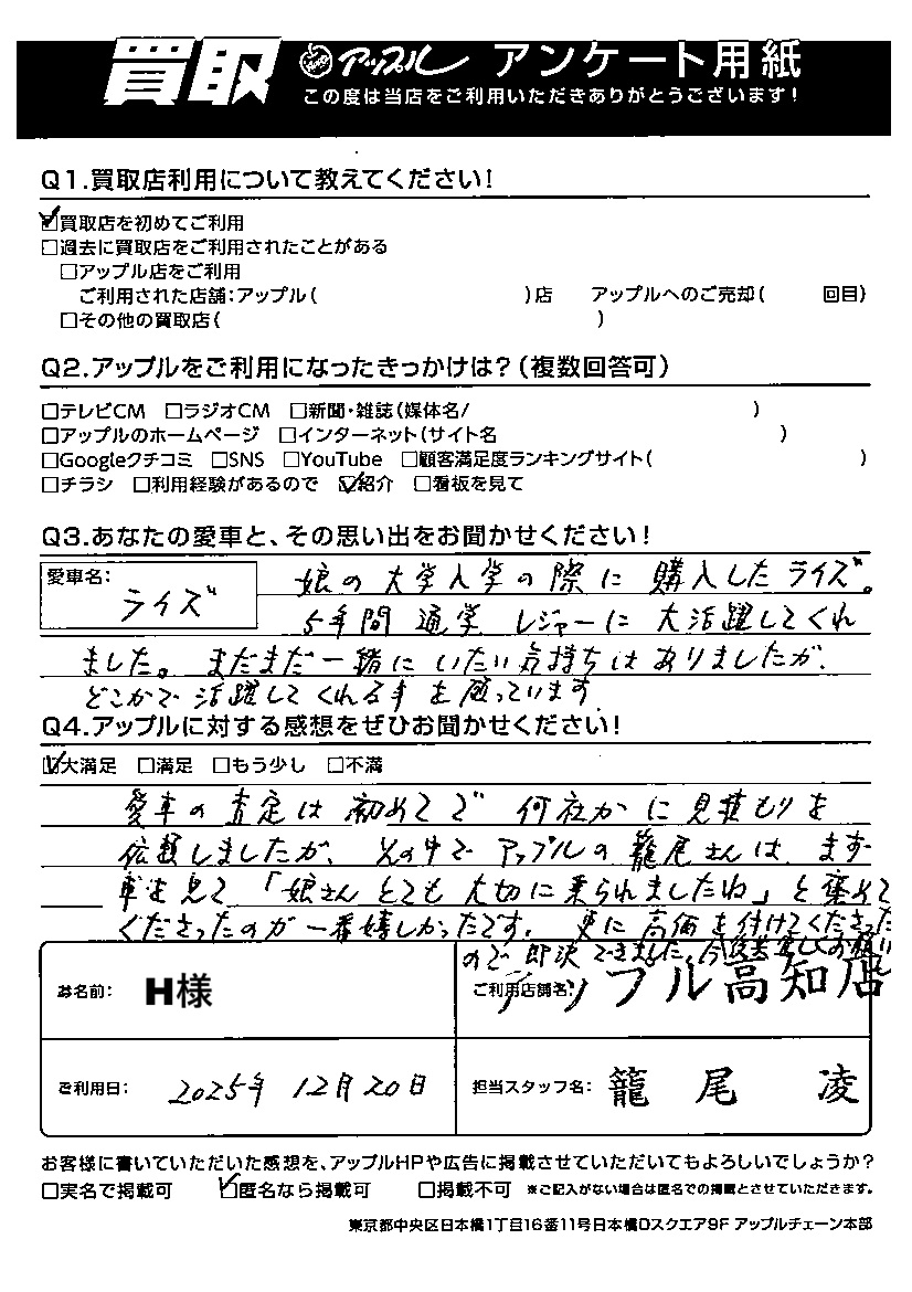 愛車の査定は初めてで何社か見積もりを依頼しましたが、その中でアップルの籠尾さんは、まず車を見て「娘さんとても大切に乗られてましたね」と褒めてくださったのが一番嬉しかったです。更に高価を付けてくださったので、即決できました。今後共宜しくお願いします。