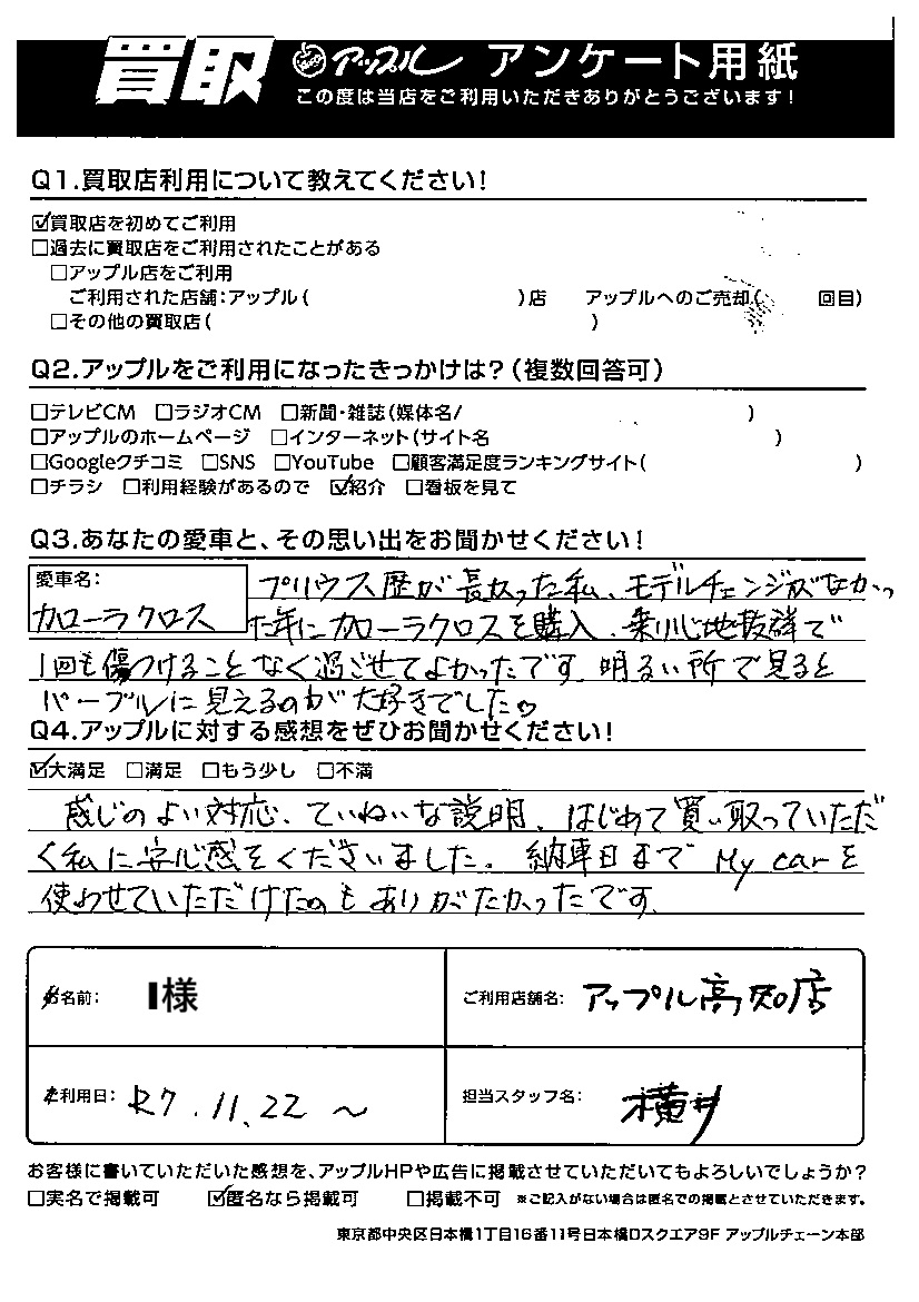 I様 車名:トヨタ カローラクロス