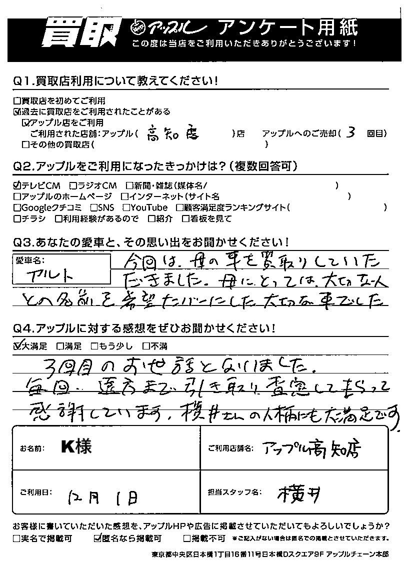 K様 車名:スズキ アルト (2015年12月以降のワークス含む)