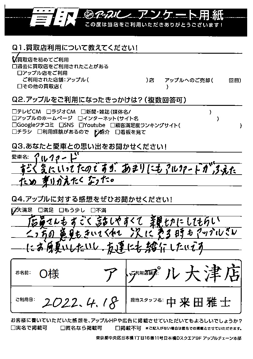 店員さんもすごく話しやすくて親切にしてもらい、こっちの意見もきいてくれて次に売る時もアップルさんにお願いしたいし、友達にも紹介したいです。