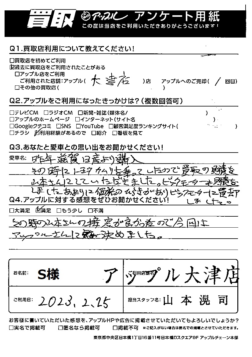 お車のご相談・ 査定だけでもOK! カンタン 入力 30秒 アップルがブランド買取始めました! お電話でも受付中! 受付時間10:00~19:00 077-527-9060 お車のご相談・ 査定だけでもOK! カンタン 入力 30秒 アップルがブランド買取始めました! お電話でも受付中! 受付時間10:00~19:00 077-527-9060 アップルがブランド買取始めました! お電話でも受付中! 受付時間10:00~19:00 077-527-9060 店舗情報 在庫車 スタッフ紹介 ブログ お客様の声 キャンペーン 無料査定 click お客様の声 ご記入日: 2023/08/20 S様 ご利用日:2023年2月25日 担当:山本Q.アップルに対する感想をぜひお聞かせください!満足この時の山本さんの接客が良かったので今回はアップルさんに決めました。 前へ 次へ お客様の声一覧を見る