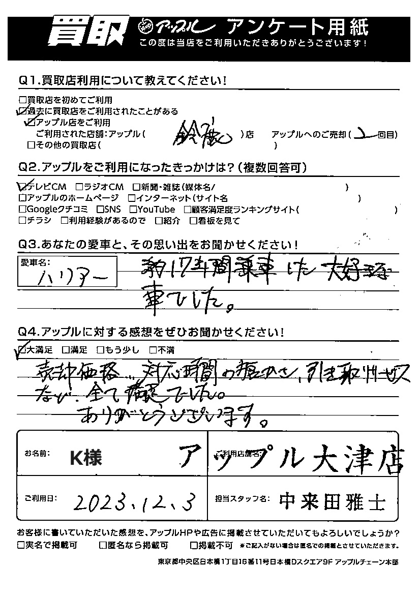 ご利用日:2023年12月3日 担当:中来田雅士
