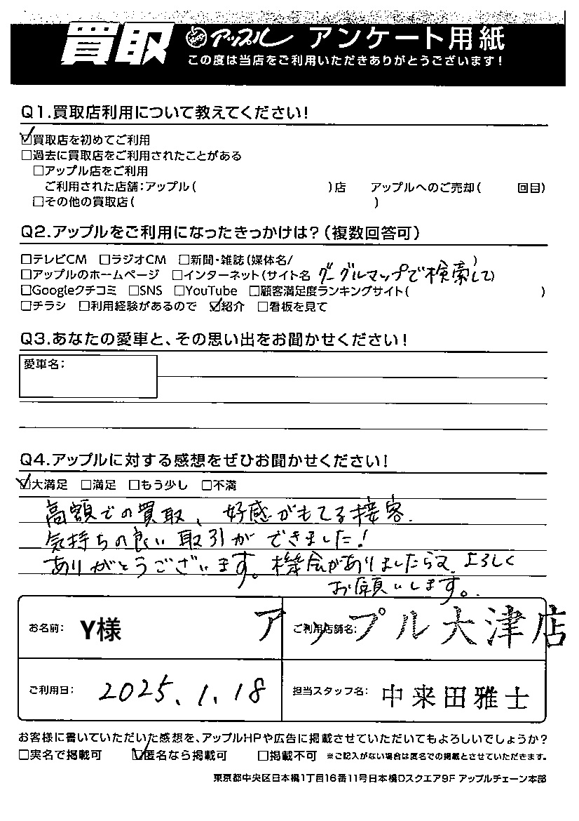 お車のご相談・ 査定だけでもOK! カンタン 入力 30秒 アップルがブランド買取始めました! お電話でも受付中! 受付時間10:00~19:00 077-527-9060 お車のご相談・ 査定だけでもOK! カンタン 入力 30秒 アップルがブランド買取始めました! お電話でも受付中! 受付時間10:00~19:00 077-527-9060 アップルがブランド買取始めました! お電話でも受付中! 受付時間10:00~19:00 077-527-9060 店舗情報 在庫車 スタッフ紹介 ブログ お客様の声 キャンペーン 無料査定 click お客様の声 ご記入日: 2025/01/18 Y様 【アップルに対する感想をぜひお聞かせ下さい!】大満足!高額での買取、好感が持てる接客気持ちの良い取引ができました!ありがとうございます。機会がありましたら又よろしくお願いします。担当:中来田 前へ 次へ お客様の声一覧を見る