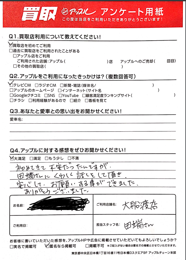 A 初めてきて不安だったんですが田端さんにくわしく話しをして頂き安心してお願いする事ができました。