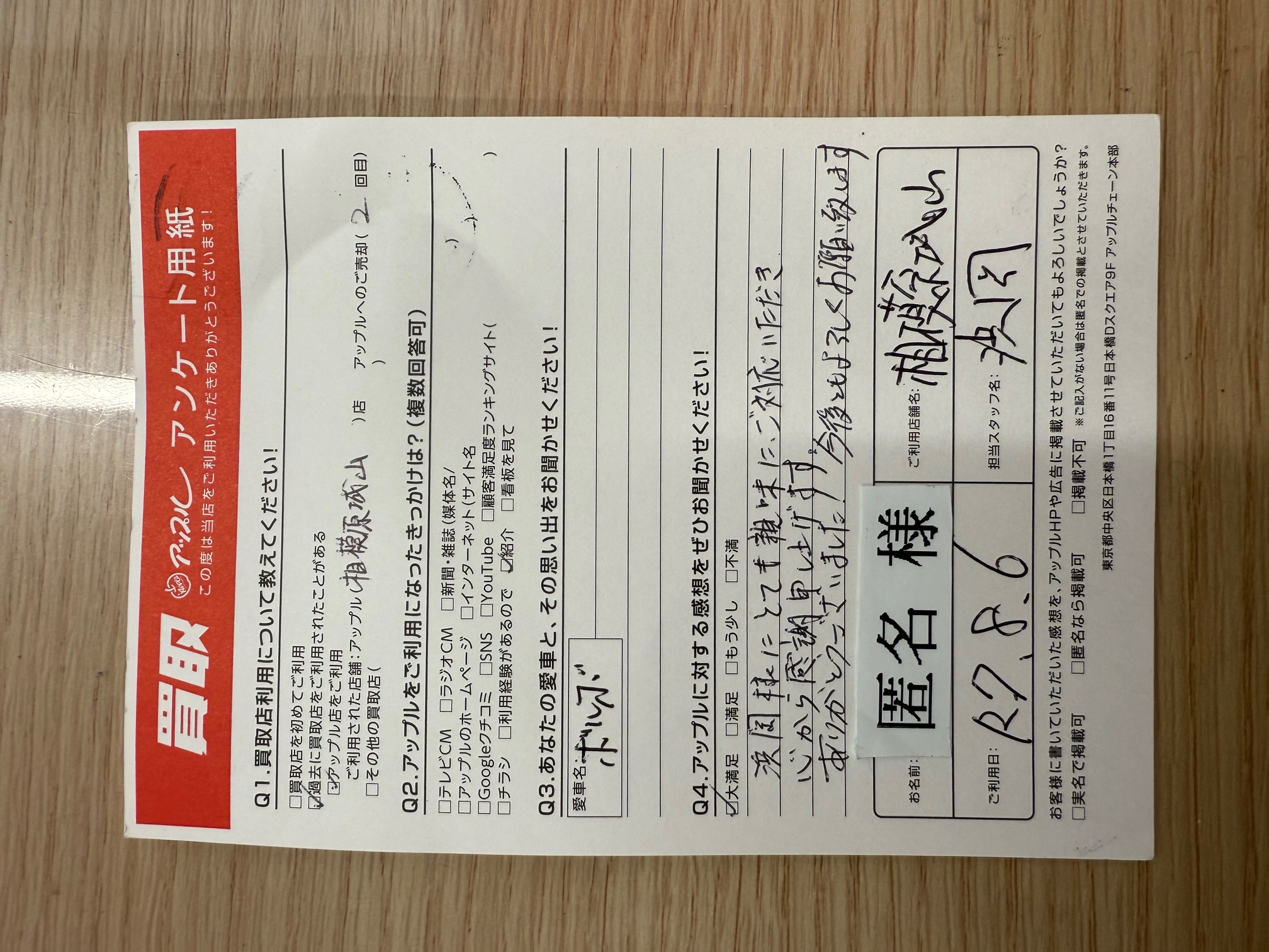 お車のご相談・ 査定だけでもOK! カンタン 入力 30秒 アップルがブランド買取始めました! お電話でも受付中! 受付時間10:00~18:00 0120-782-356 お車のご相談・ 査定だけでもOK! カンタン 入力 30秒 アップルがブランド買取始めました! お電話でも受付中! 受付時間10:00~18:00 0120-782-356 アップルがブランド買取始めました! お電話でも受付中! 受付時間10:00~18:00 0120-782-356 店舗情報 在庫車 スタッフ紹介 ブログ お客様の声 キャンペーン 無料査定 click お客様の声 ご記入日: 2025/08/06 S様 車名:ボルボ V60 Q4.アップルに対する感想を是非お聞かせください!浜岡様にとても親身にご対応いただき心から感謝申し上げます。ありがとうございました!今後ともよろしくお願い致します。 前へ 次へ お客様の声一覧を見る