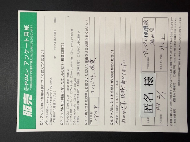 お車のご相談・ 査定だけでもOK! カンタン 入力 30秒 アップルがブランド買取始めました! お電話でも受付中! 受付時間10:00~18:00 0120-782-356 お車のご相談・ 査定だけでもOK! カンタン 入力 30秒 アップルがブランド買取始めました! お電話でも受付中! 受付時間10:00~18:00 0120-782-356 アップルがブランド買取始めました! お電話でも受付中! 受付時間10:00~18:00 0120-782-356 店舗情報 在庫車 スタッフ紹介 ブログ お客様の声 キャンペーン 無料査定 click お客様の声 ご記入日: 2026/02/01 H様 車名:トヨタ アクア Q3ご購入されたお車をお選びいただいた理由をお聞かせください!コンパクト、燃費Q4.アップルに対する感想を是非お聞かせください!わかりやすい説明で助かりました。 前へ 次へ お客様の声一覧を見る
