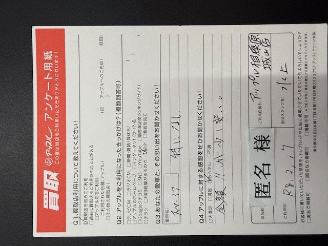 お車のご相談・ 査定だけでもOK! カンタン 入力 30秒 アップルがブランド買取始めました! お電話でも受付中! 受付時間10:00~18:00 0120-782-356 お車のご相談・ 査定だけでもOK! カンタン 入力 30秒 アップルがブランド買取始めました! お電話でも受付中! 受付時間10:00~18:00 0120-782-356 アップルがブランド買取始めました! お電話でも受付中! 受付時間10:00~18:00 0120-782-356 店舗情報 在庫車 スタッフ紹介 ブログ お客様の声 キャンペーン 無料査定 click お客様の声 ご記入日: 2026/02/17 M様 車名:スズキ スペーシア Q4.アップルに対する感想を是非お聞かせください!金額、が少し安い。 前へ 次へ お客様の声一覧を見る