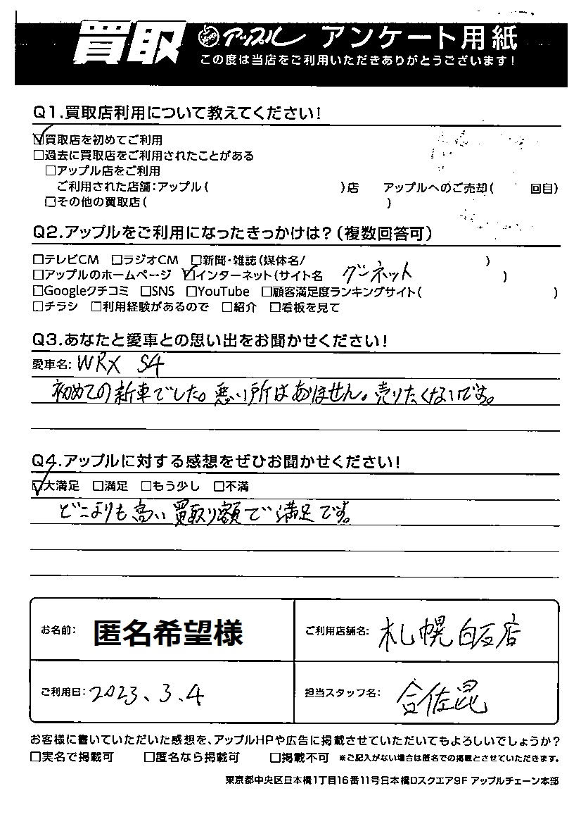 匿名希望様 車名:スバル WRX S4