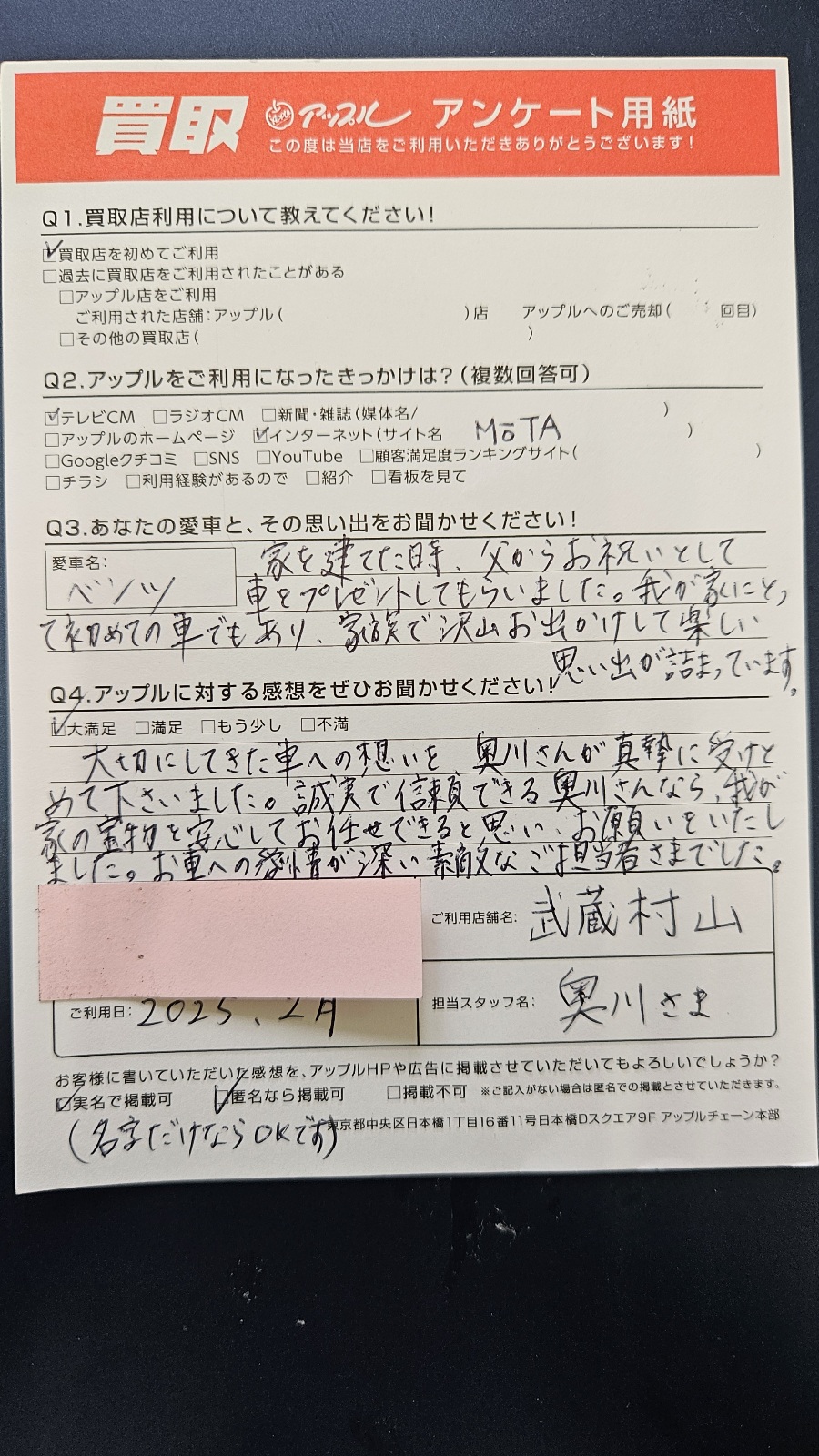 ご利用日:2025年2月28日 担当者名:奥川