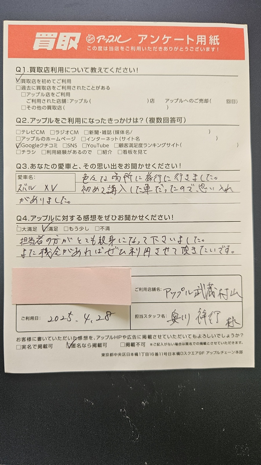 ご利用日:2025年4月28日 担当者名:奥川