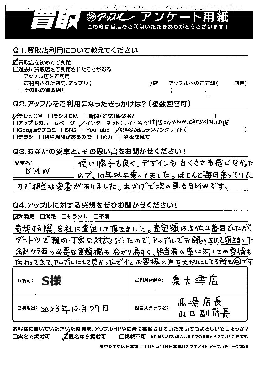 売却する際、8社に査定して頂きました。査定額は上位2番目でしたが、ダントツで親切丁寧な対応だったので、アップルでお願いさせて頂きました。名刺ウラ面の必要な書類欄も分かり易く、担当者の車に対しての愛情も伝わってきて、アップルにして良かったです。お客様の声を大切にしている所も◎です。